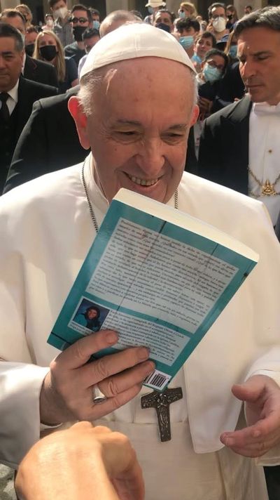 When in Rome, Pope Francis happily receives Karla's book in his native language.